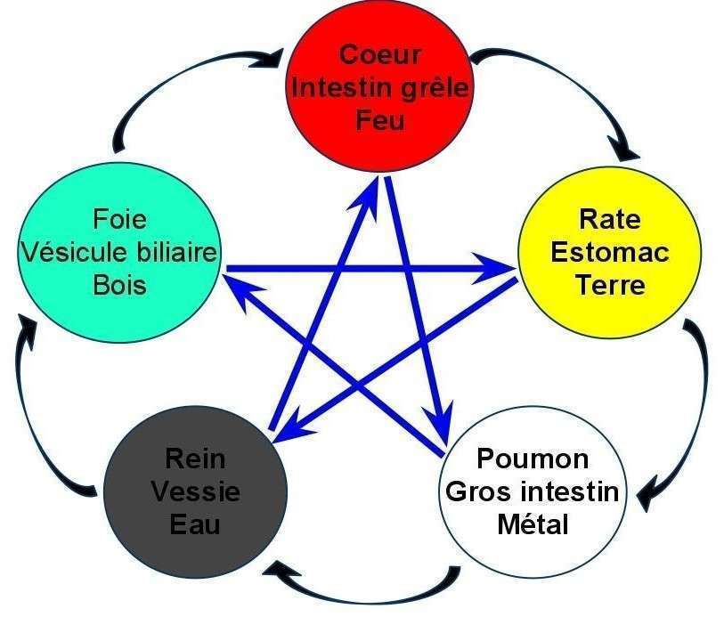 Les 5 mouvements se donnent vie dans un ordre précis, selon le principe d'engendrement : l'Eau engendre le Bois, qui engendre le Feu, qui engendre la Terre, qui engendre le Métal, qui engendre l'Eau. Quand au principe de contrôle, il fonctionne dans le même sens, mais non linéairement : l'Eau contrôle le Feu, qui contrôle le Métal, qui contrôle le Bois, qui contrôle la Terre, qui contrôle l'Eau. Les cycles d'engendrement et de contrôle forment, ensemble, un système équilibré.